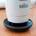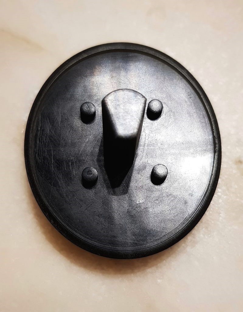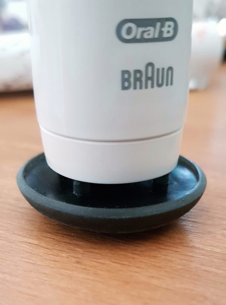 Cependant, poser la brosse directement sur le lavabo ou la tablette après usage génère rapidement des traces et un développement de bactéries à la base de la brosse, qui reste mouillée. C'est pourquoi nous avons créé ce support, qui permet de recueillir l'eau, évite les traces sur le lavabo, tout en ménageant des espaces entre la brosse et le lavabo pour que la brosse puisse sécher. Ce support est plus facile à nettoyer que la base (à cause du fil électrique de cette dernière), et on peut le faire tremper dans le vinaigre pour le désinfecter, par exemple.